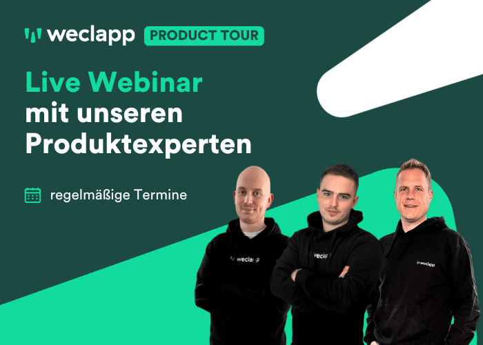weclapp Product TourDu bist neu hier und möchtest unsere Software kennenlernen? Dann melde dich zu einem unserer Termine für das Live-Webinar mit unseren Produkt-Experten an! Wir freuen uns auf dich.